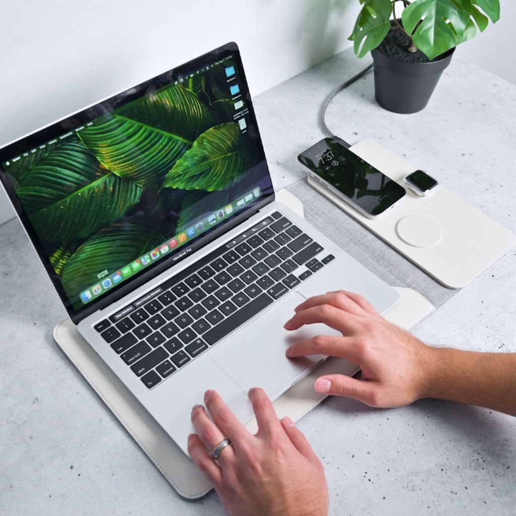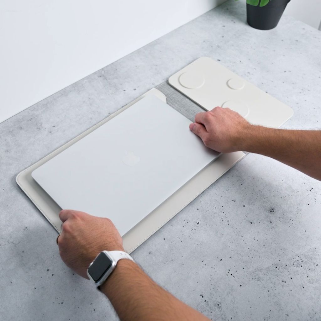 A multifunction sleeve that replaces your mat, charger, and organizer—keeping your MacBook safe and your essentials powered wherever you go.
