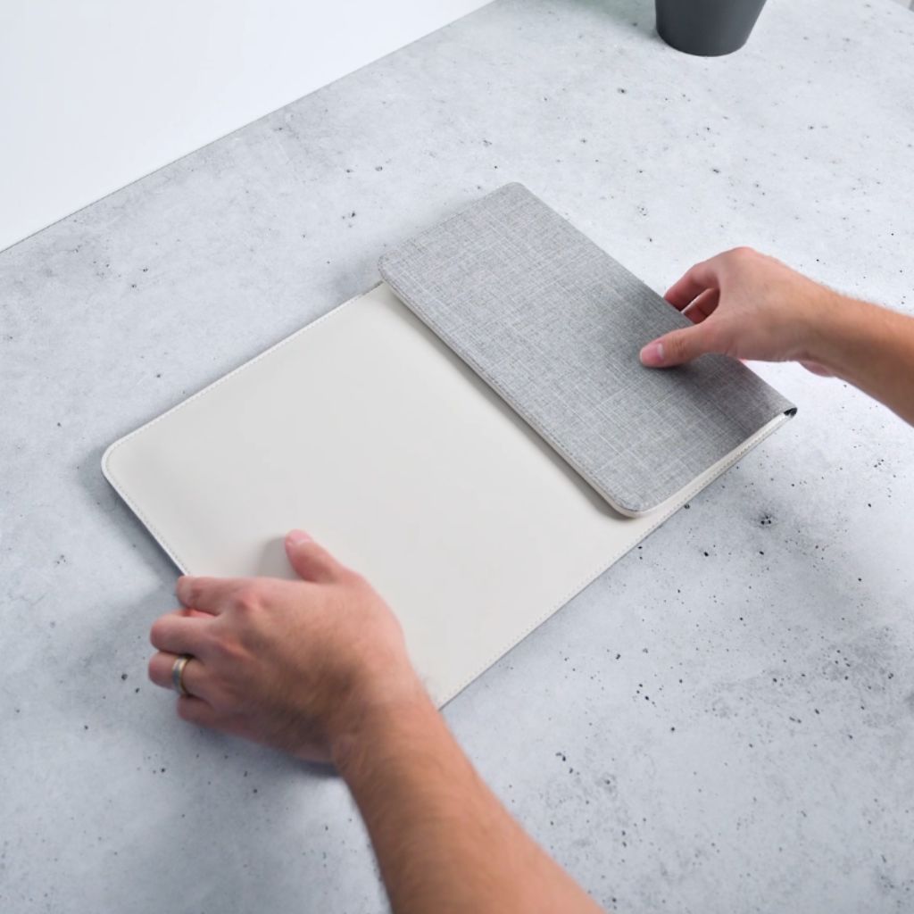 A lightweight, compact sleeve that carries easily and transforms into your full workspace.